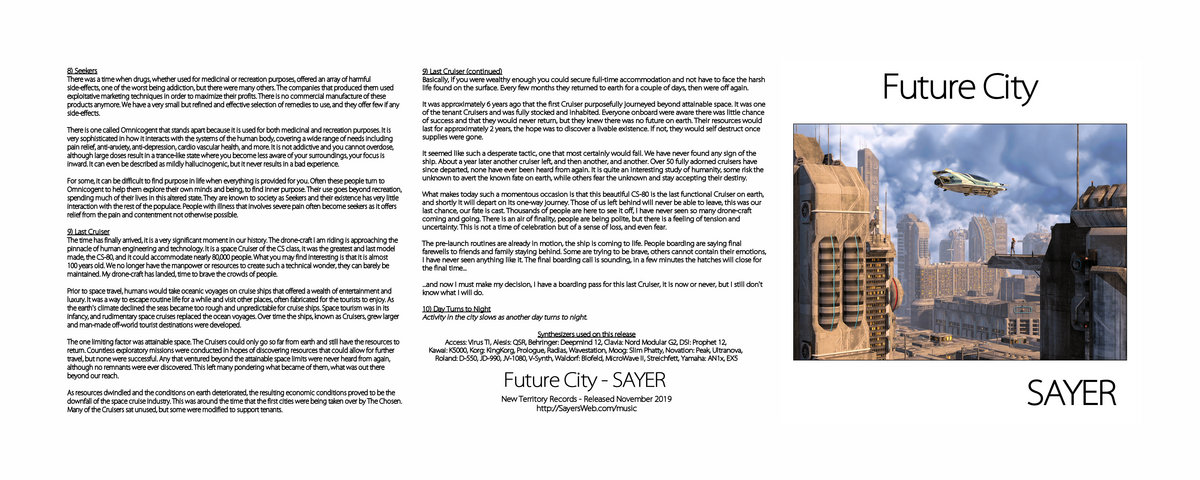 The CD version of Future City includes a 6 panel booklet that contains the full short story along with the CD artwork. The electronic download version includes a PDF document with the short story including some of the CD artwork. The short story is also included below. I hope you will fine it entertaining.